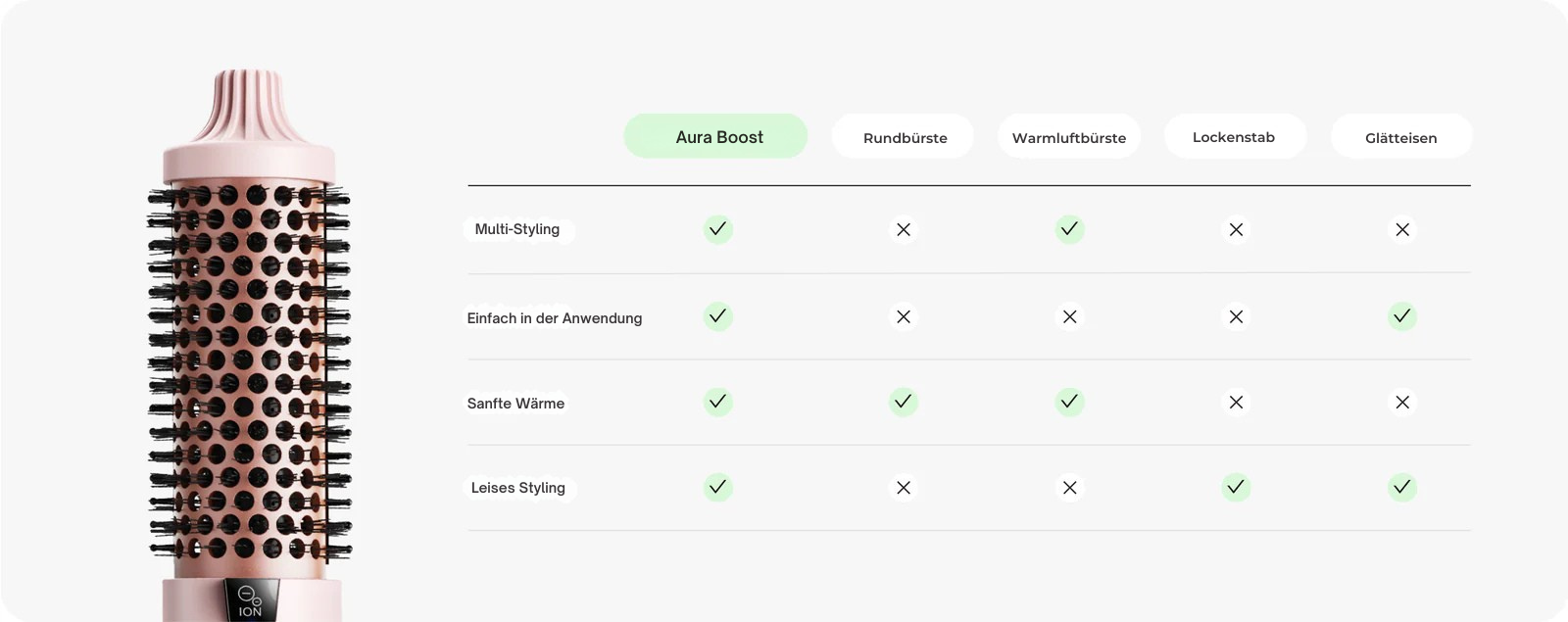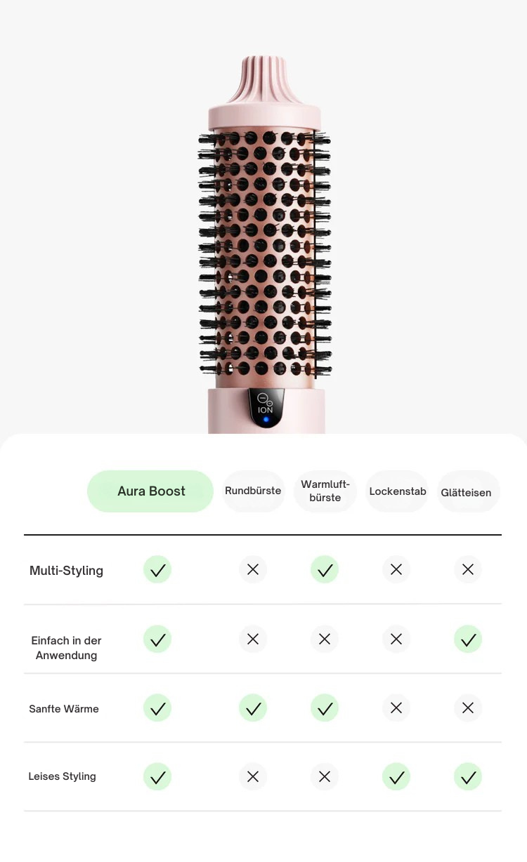 Dank ihrer fortschrittlichen WĂ€rmeleit-Technologie schĂŒtzt AURA Boost die Haarstruktur und fördert gleichzeitig das natĂŒrliche Haarwachstum. Der ionische Keramikzylinder reduziert Frizz, verbessert den Glanz und sorgt fĂŒr ein geschmeidiges, mĂŒheloses Styling.